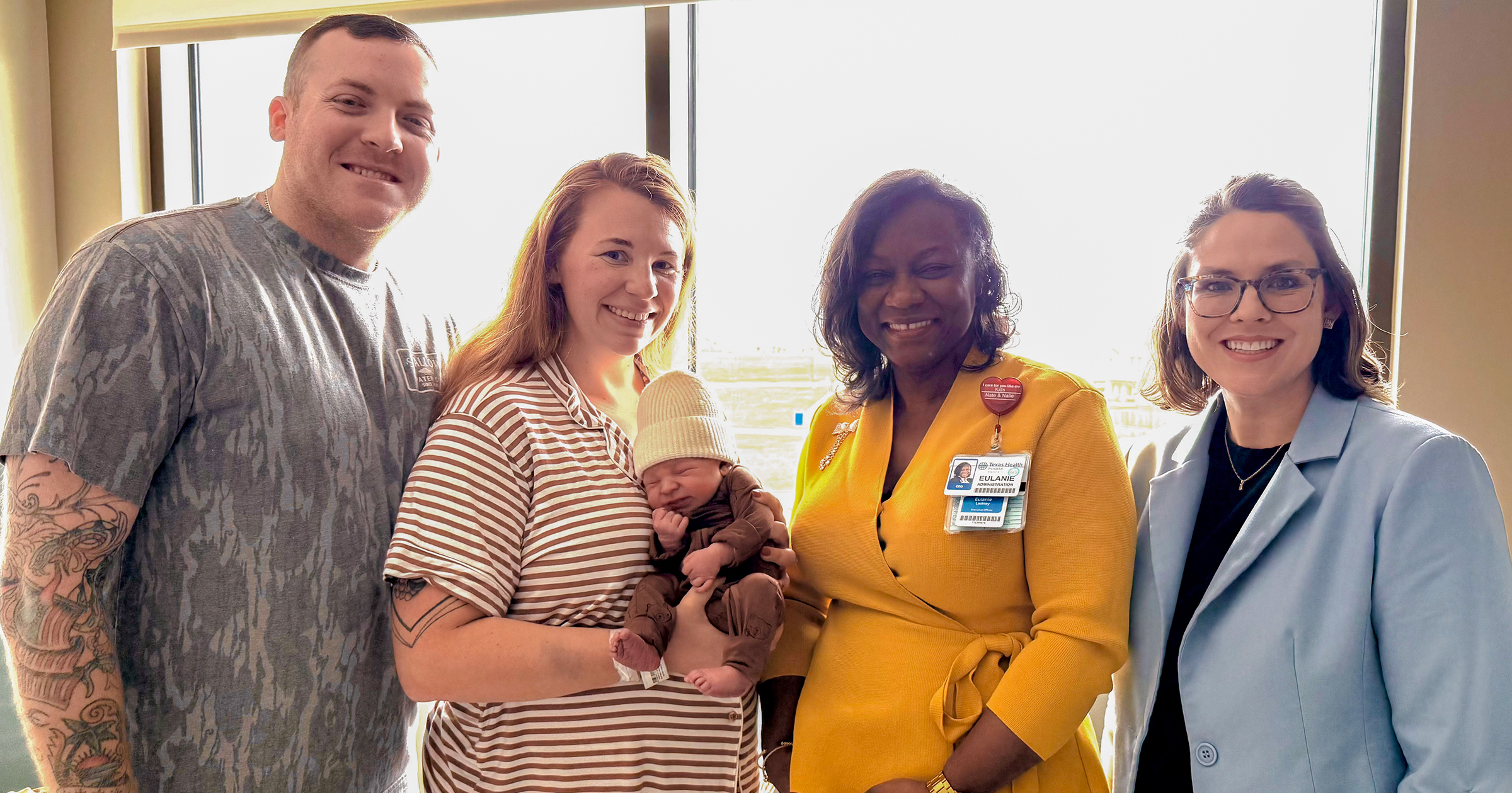 While making morning rounds on the women’s unit, Texas Health Mansfield President and CEO Eulanie Lashley learned that a family was on the way in active labor and might not make it to the unit in time. Lashley brought a wheelchair to the hospital entrance and alerted Chief Medical Officer Heather Granado, DO, as the team prepared to receive the family.